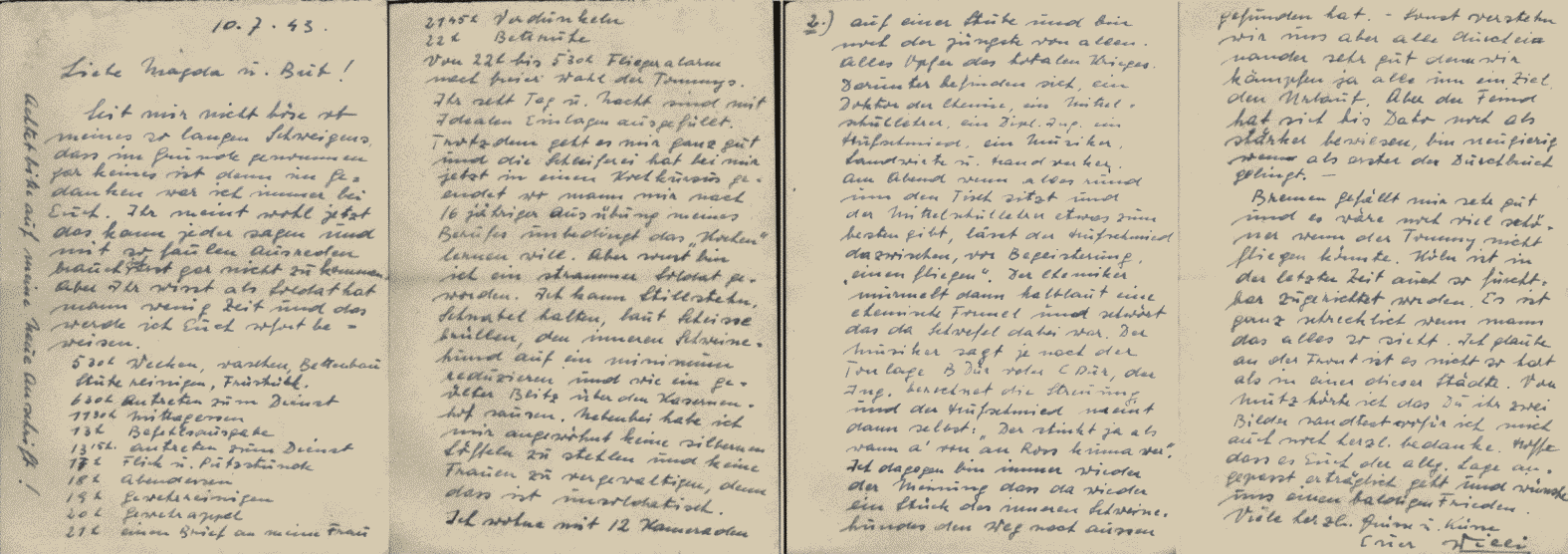 Bremen gefällt mit sehr gut und es wäre noch viel schöner wenn der Tommy nicht fliegen könnte. Köln ist in der letzten Zeit auch so furchtbar zugerichtet worden. Es ist ganz schrecklich wenn man das alles so sieht. Ich glaube an der Front ist es nicht so hart als in einer dieser Städte. Von Mutz hörte ich das Du ihr zwei Bilder sandtest wofür ich mich auch noch herzl. bedanke. Hoffe dass es Euch der allg. Lage angepasst erträglich geht und wünsche uns einen baldigen Frieden.