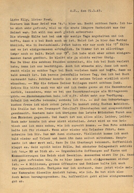 Gestern kam Euer Brief vom 14.1. hier an. Recht schönen Dank, Ich habe mich sehr gefreut, weil es die erste längere Nachricht aus der Heimat war. Ich will nun auch gleich antworten: