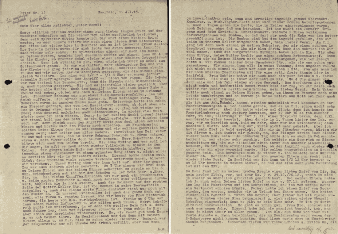 Today I would like to write a long letter to you on the typewriter and tell you everything in detail because since 31-12 I could only send you a small letter, in which I included a kind greeting from our parents. I am now back in Saarfeld and it is an old-fashioned dreary dull day. In spite of the heavy attacks, the days in Berlin were a joy. On 31st December we went to church after dinner where father Nebel held a nice sermon. If I would be in Berlin all the time, I would go to Nebel and the sermon all the time. It was a cold and very windy day and everyone went straight home from church. Schutzes came to us in the evening and we had just finished our evening bread when the sirens went, full alarm at once! This went on from 18.30 till 19.45; they were "only" fast bombers. It was a stiff attack. The underground was blocked from the western end to Beussel Street, also from Siemens Street to Spandau. It was enough for me, but we were fortunate. After the attack I could not find any peace and went to see if at our place and your parents' place everything was alright. At my place only some plaster came off, which I cleared straight away. I shortly spoke to Simns and Mirs. Meiniger. All the windows in our place were intact. On my way over I had already spoken to a couple, who came from Haeseler Street, if everything over there was alright, which they confirmed, and thus I went back again because there were explosions all the time because I believe there must have been used many delayed time bombs again. Even in the second night we fell asleep quickly only to be awakened by a loud bang. We then stayed up because you could not sleep so soon after an attack anyway, and we also listened to the Führer. On New Year's Day your parents wanted to come over and we wanted to have a nice day together but everything went differently. In the morning your father came by and told us that all the windows and the doors of your house were broken, my father would also come by and give a hand. Mister Schaffroth also said he would be willing to help. We ate in the afternoon and what shall I say, again sirens! and back in the cellars. Both times we went to the maternity clinic where you can sit more comfortable in a narrow hallway and not hear everything so clearly as in Pulsstift itself. Berlin was lucky this time, too, because although there were heavy formations coming, we were spared this time. The afternoon was hardly over, but still our whole day was wrecked. At three o'clock we three went to your parents' and the man manage it at six. In between I checked the damage at the corner of Soor and Haas Street. All that's left from the small coachmans house is a pile of rubble, and the two great houses on the corner are completely gutted although they're still standing. The wooden fence on the right side of Gottfried-Keller Street is completely charred and also the small villa has only its walls still standing. At our Linden Lane the roof is completely gone, the doors and windows broken, all according to Mrs. Dientrich, who came back from Berlin today. At six the sirens went again, and we ran home. I had to support Mr. Schaffroth because of his stiff leg, and because there was still some snow on the streets, before New Year's Day we had a nice pack of snow in Berlin. Apart from this we had fine winter weather. We got home safely; there were no more air raids. I was alone with my parents on New Year's Eve, and on the 2nd Jan. I had to leave again. This made New Year's Day a busy working day, but one must be grateful that one survives these attacks. Kanal Street and Rich. Wagner were bombed again, and two days after people were trapped in the cellars, people still gave tapping signals without rescuers getting to them. Isn't that terrible? Further there are on the corner of Christ and Danelmann Street two more blocks completely destroyed by bombs, so that now only the corner of the butter shop is intact. These bombs fell while we were in our cellar, my dear Werni. On 02-01 I went to our shoemaker, who made me a nice belt from leather and colored it blue. But I'll write to you about that later. Also the stockings I ordered I got in Berlin, we then ate in the afternoon where mother cooked us a nice pot of green peas. We then wanted to go to your parents', but as I told you, we only got as far as the corner of Spandauer Street, whent hey came and met us on the way. We then all went to my place because I did not want to go back the whole way. Mrs. Schutze gave me some onions and biscuits. She is always very nice to me. At four o'clock we all went our way again. Going away is always hard and I hope the day will come when we will both be together in Berling again, my dear Werni. My father wanted to go to your parents' once more to put some planks on your parents' windows so that thank God your parents will have everything in order also. As I came to the station, there were a terrible many people at the ticket window and, I thought, it would not be so bad the 2nd of January! But I was lucky again because I was able to get on the extra holiday train to Augsburg that left the station at 17.36 where I, albeit in the 3rd class, got a corner seat; the 2nd class was all taken. But because we were the 1st car behind the engine, it was nice and arm, it even became too warms, but only till Weissenfels: when the electric engine took over, there was no more heating. But I soon reached my destination. When we were in Jüterbog we heard the sirens, and I immediately thought: surely these planes are for Berlin. The next day I also heard it in a military bulletin and everything was very worrying to me again. I requested a call to Simons in the afternoon when we suddenly got a call at the Lindenallee that we could inform if the attack was on Charlottenburg, which they denied. Apparently it was mainly on Neukölin. That put my mind at rest for a bit, and I cancelled my request. I hope I will soon receive mail from my dear parents again. I w