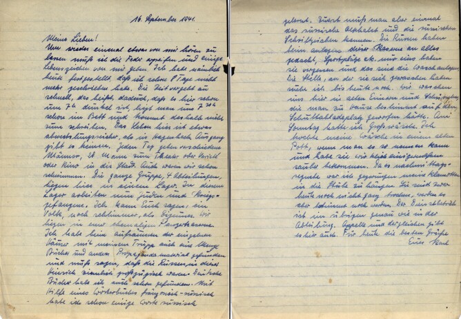Life is more varied than in Hagenbach. We can't leave this place by ourselves. Each day a different group of men, twenty or so go to the theater or to a show or to cinema in town. We also go for a swim. The whole group, four units, is stationed in a camp. The work in this camp is done by Jews and POW's only, people - I can say this to you - even worse than gypsies.